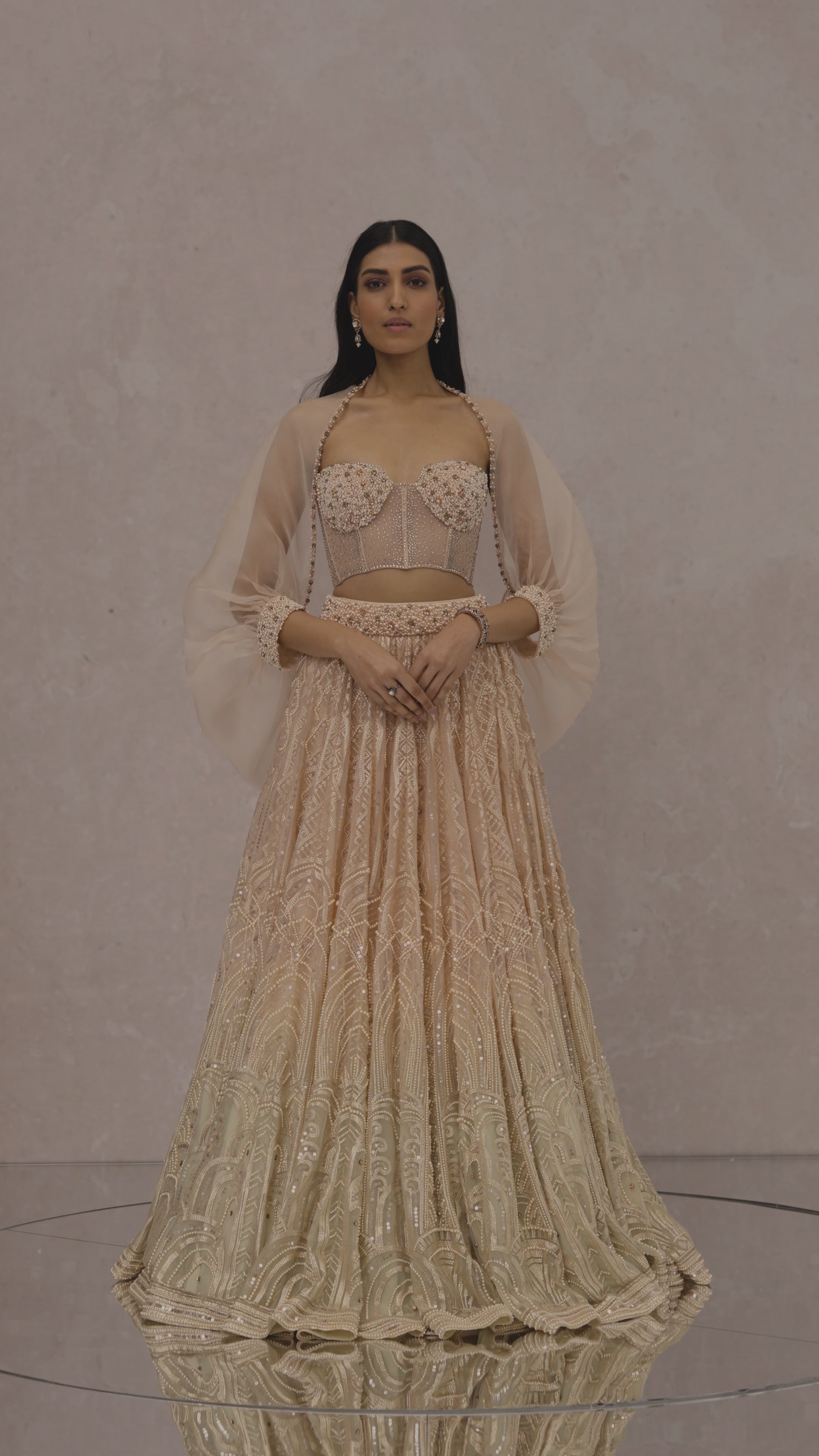 Pearl and sequin embroidered panelled lehenga paired with a pearl border