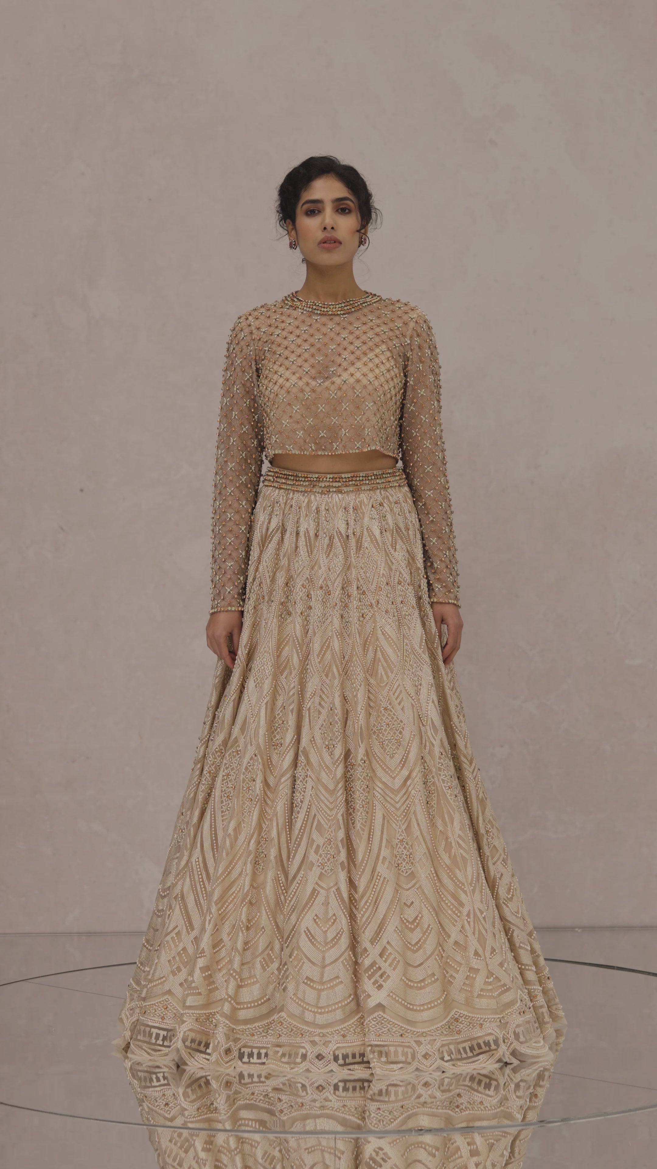 Pearl embroidered panelled lehenga paired with a Swarovski encrusted sheer