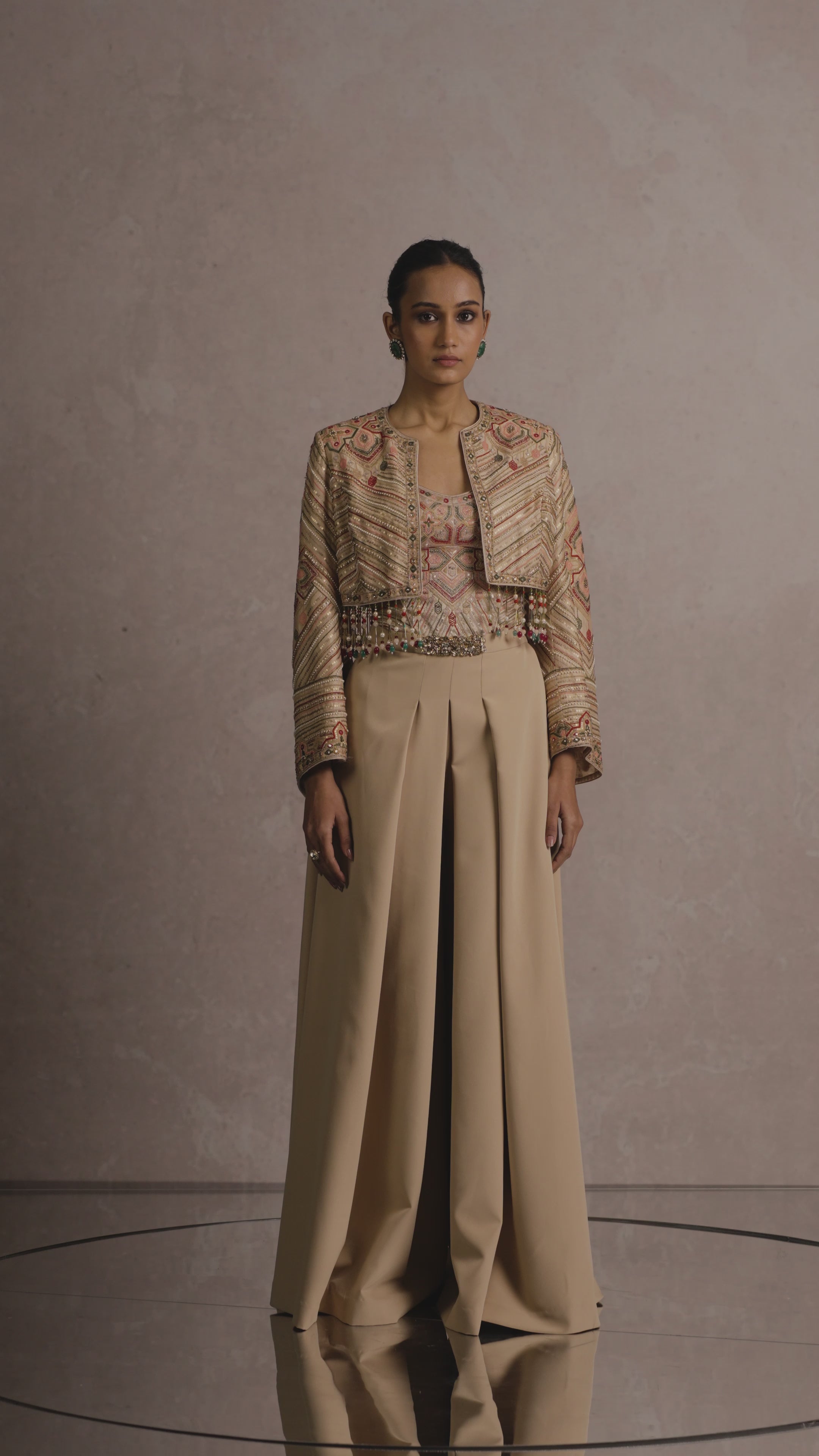 Inspired by Phulkari, the embroidered cropped jacket is paired with a structed embroidered corset and fluid mettalic pants with jewel accentuations on the waist.