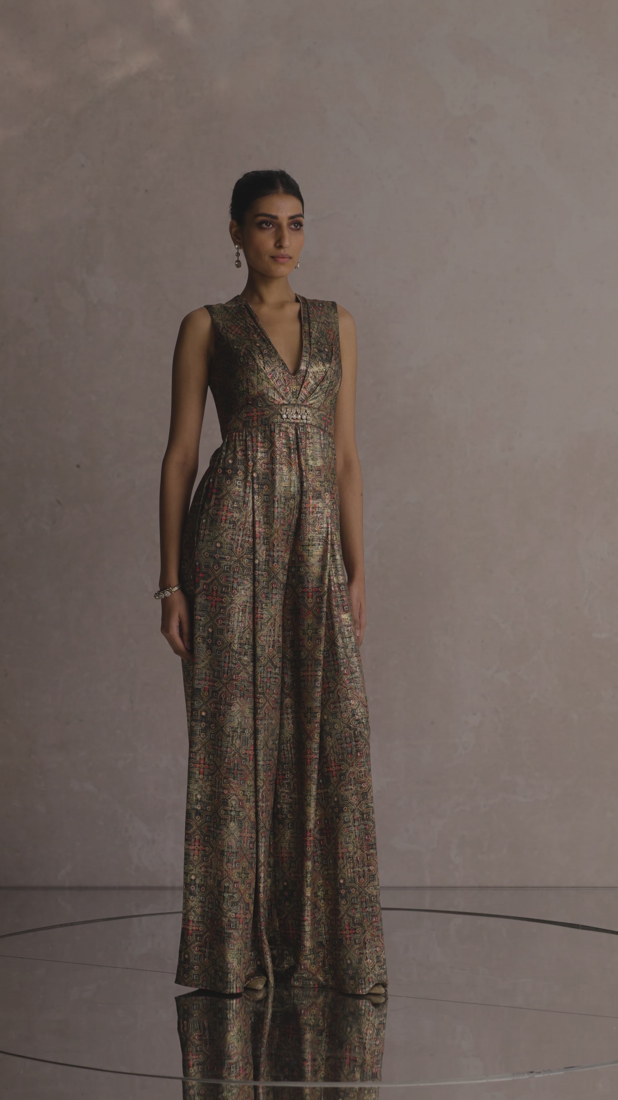 Inspired by Phulkari, the signature embroidered gilet is paired with a complementing jumpsuit with crystal accentuations on the waist.